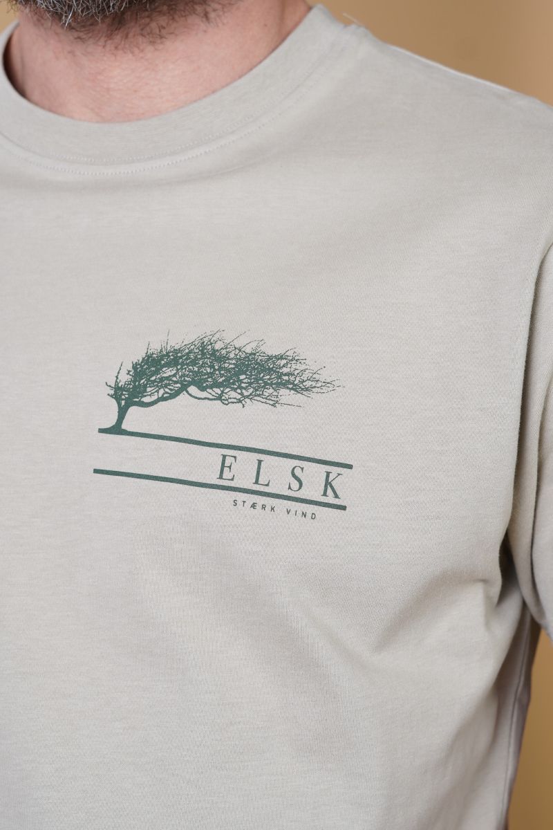 På brystet sidder et lille print med et vindblæst træ, som man kender det fra kysten. Under motivet står ELSK og med fin skrift teksten “STÆRK VIND”. Et stemningsfuldt print, der leder tankerne mod rå natur, Vesterhavet, åbne kyster og vildt vejr.