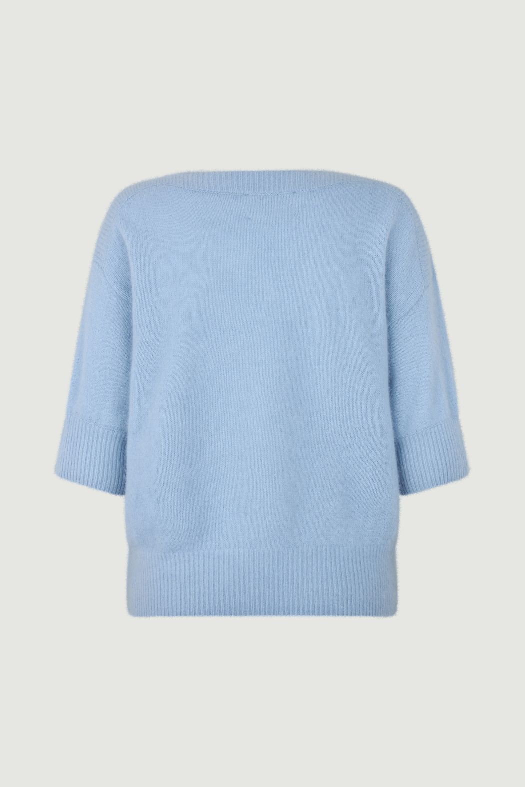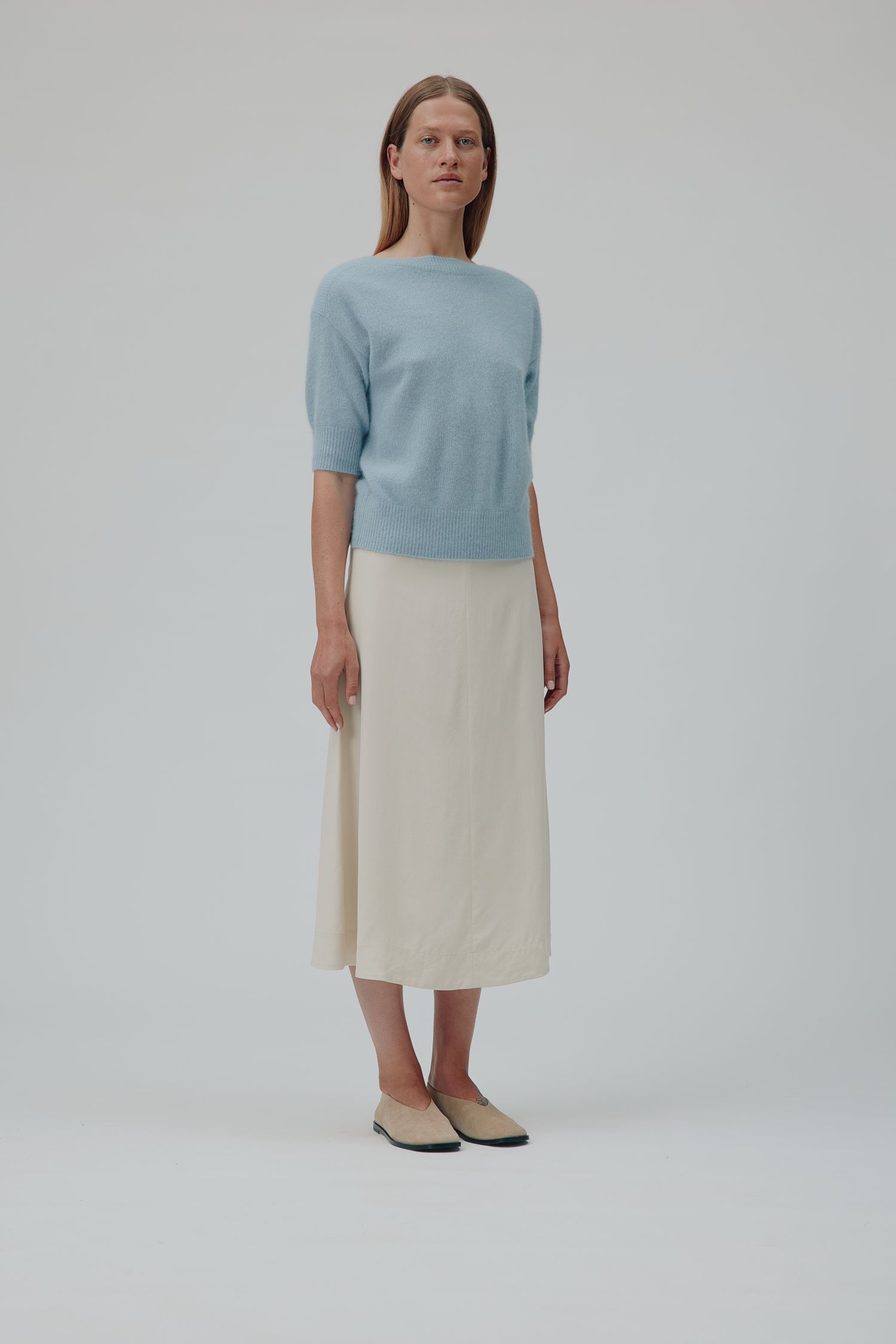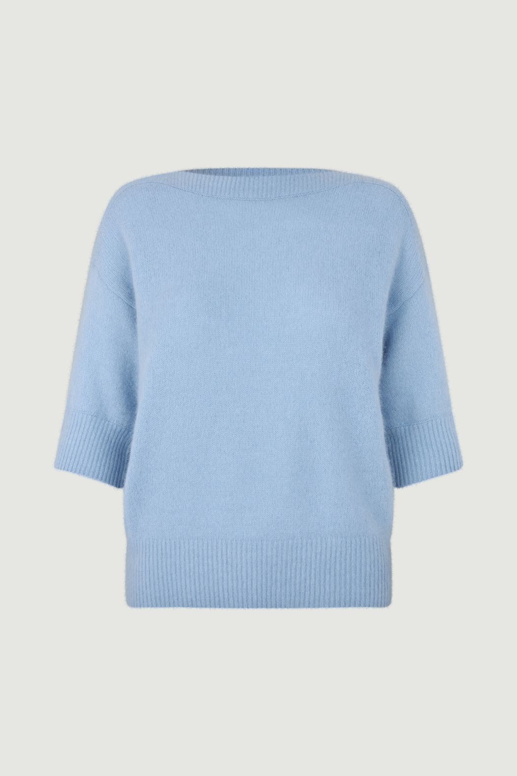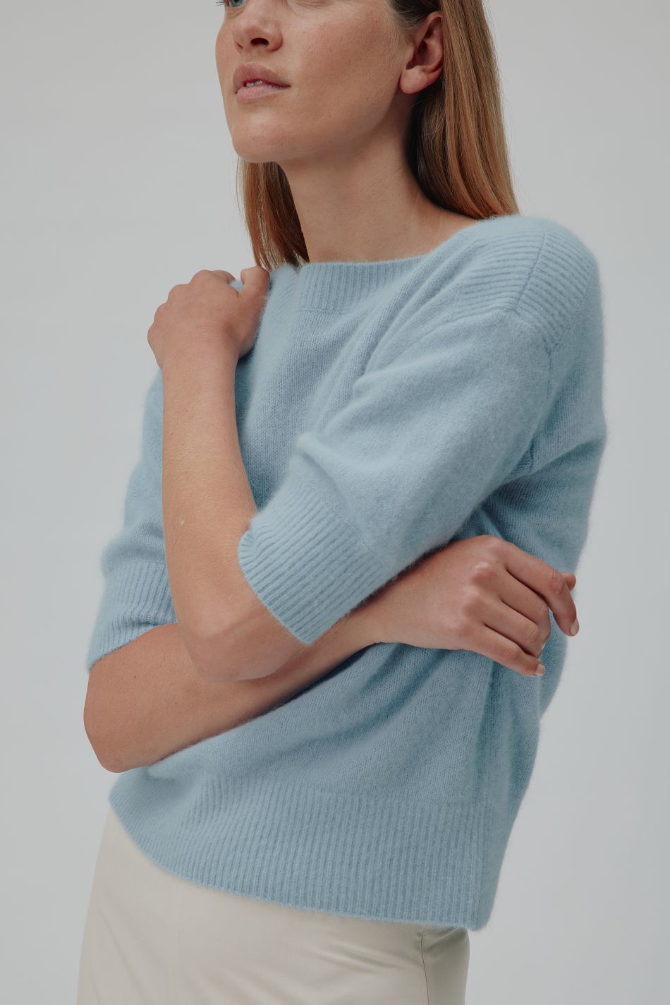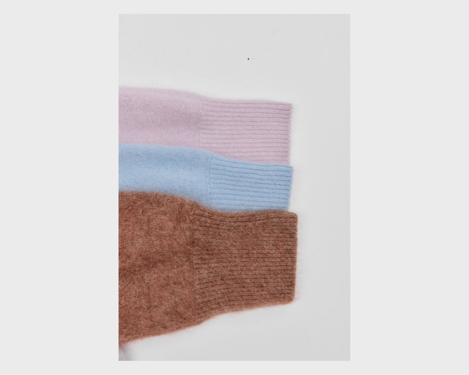 MOI er en eksklusiv og let strik i den fineste vaskebjørnsuld – en kvalitet, der overrasker de fleste med sin blødhed. Pasformen er løs og afslappet med en elegant bådudskæring og rummelige, påsatte ærmer, der går til omkring albuen. Ribkanter ved hals, ærmer og bund giver en rolig og smuk afslutning.