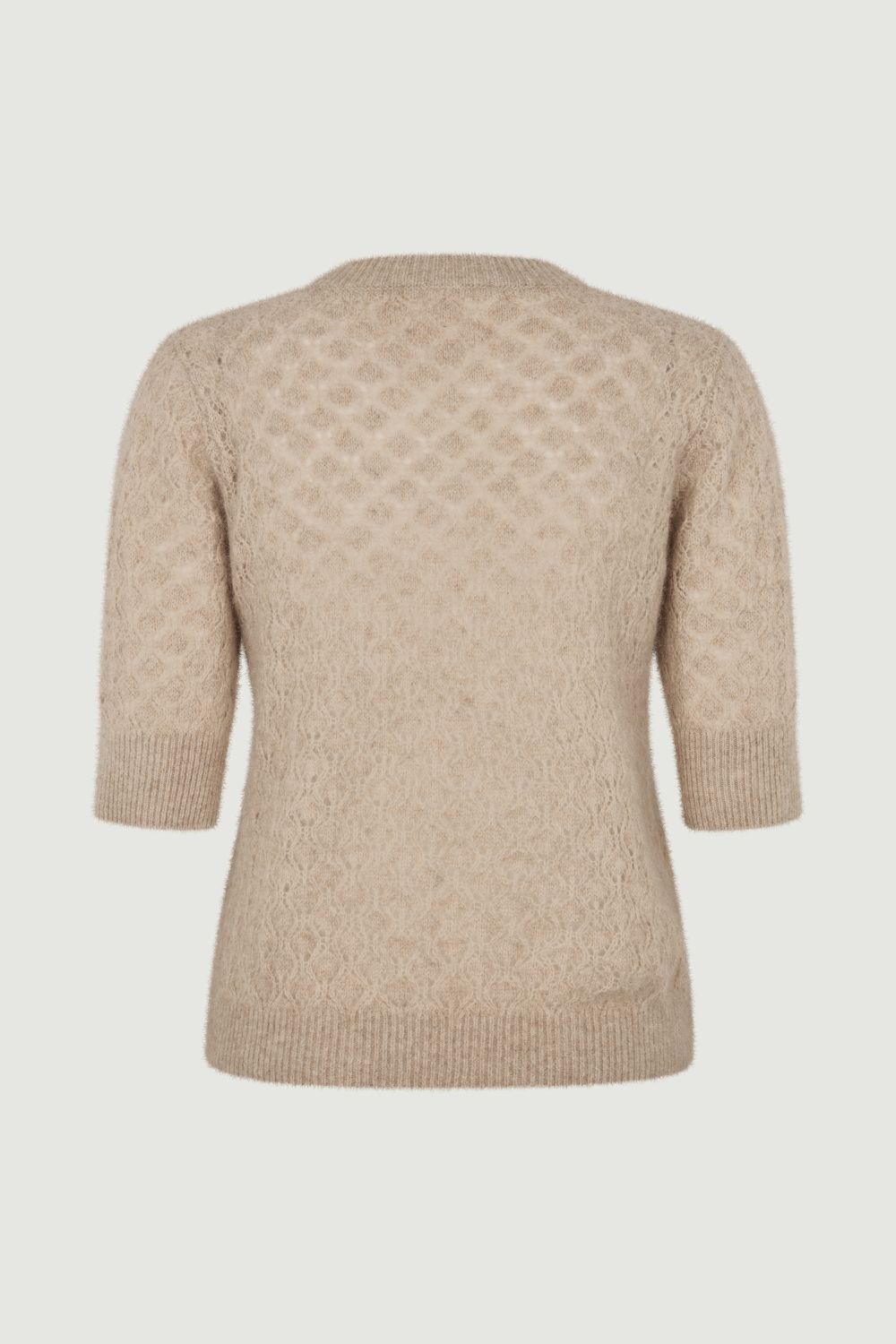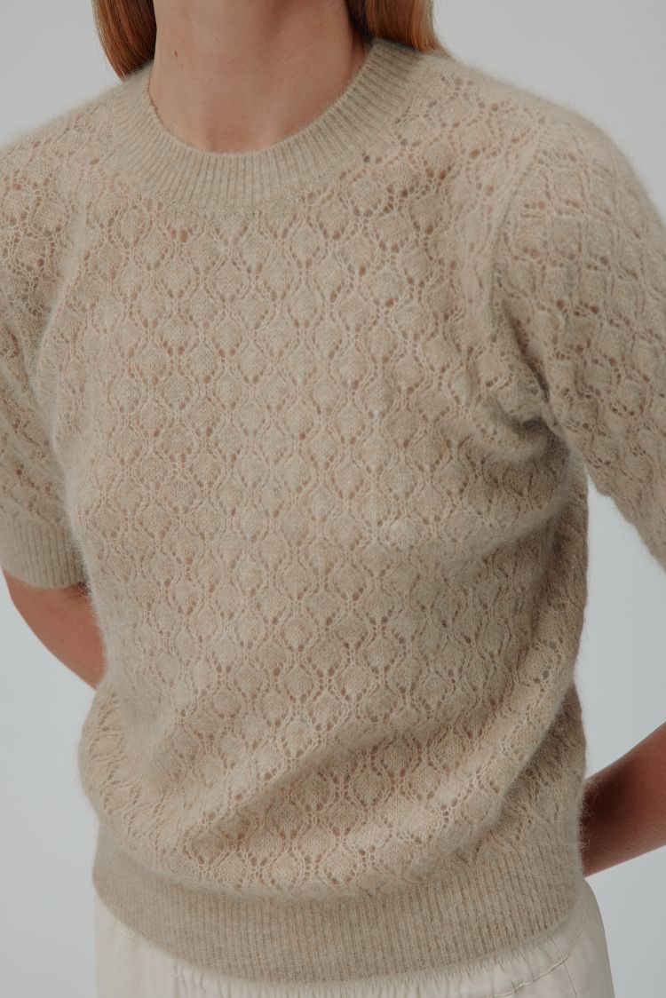 Denne strikbluse er et smukt eksempel på kvaliteten. En utrolig elegant model med et diskret og feminint mønster, der giver dybde uden at tage over. Den har en fin, rund hals i rib, korte ærmer afsluttet med en bred ribkant og en silhuet, der falder let og ubesværet.