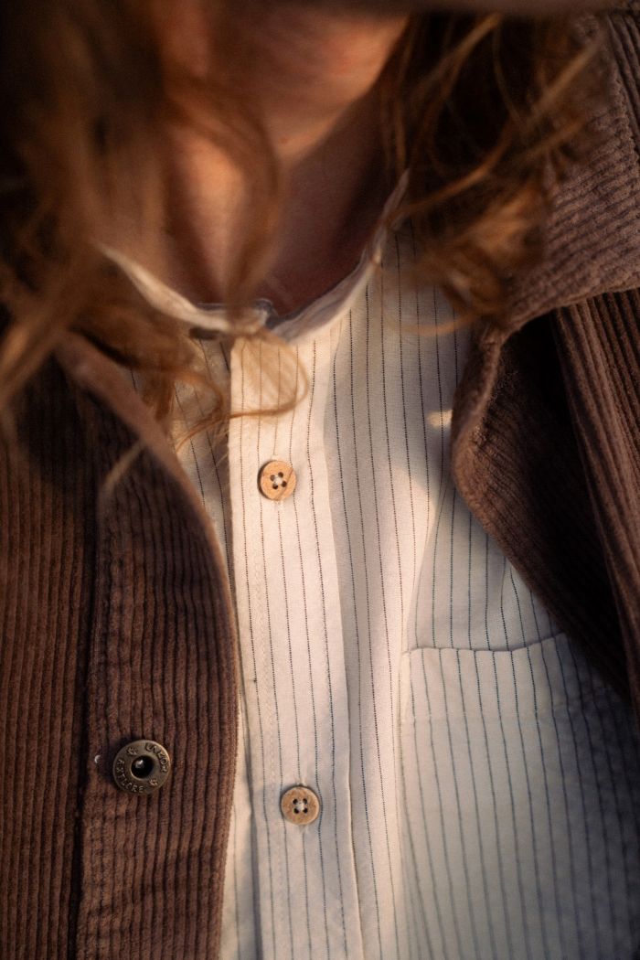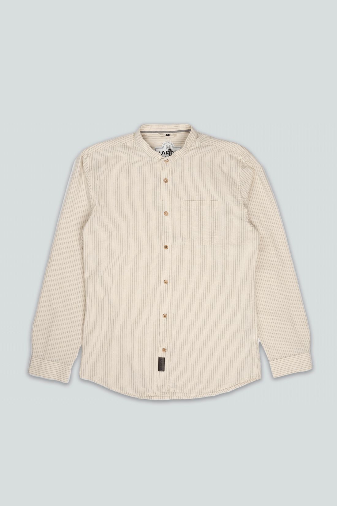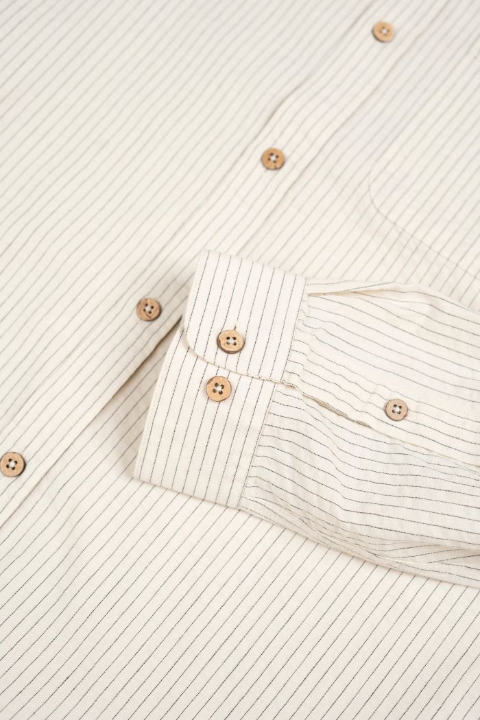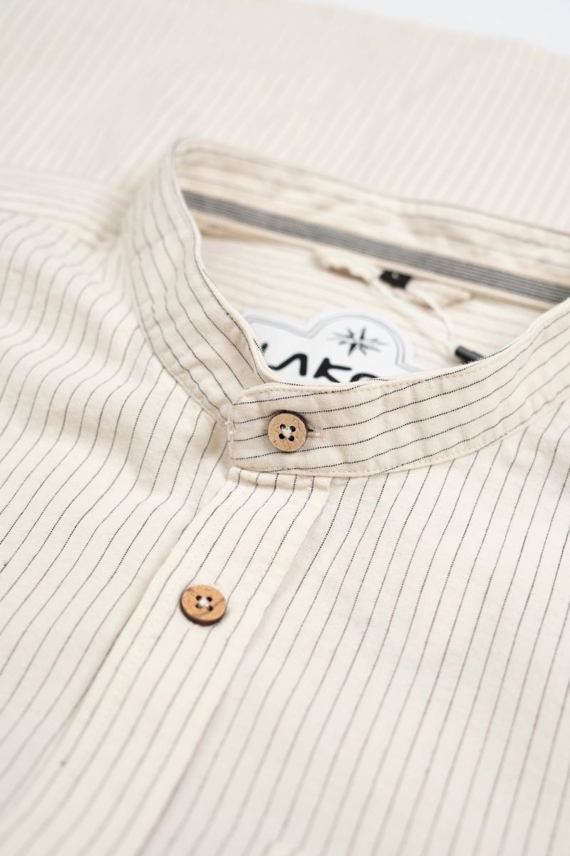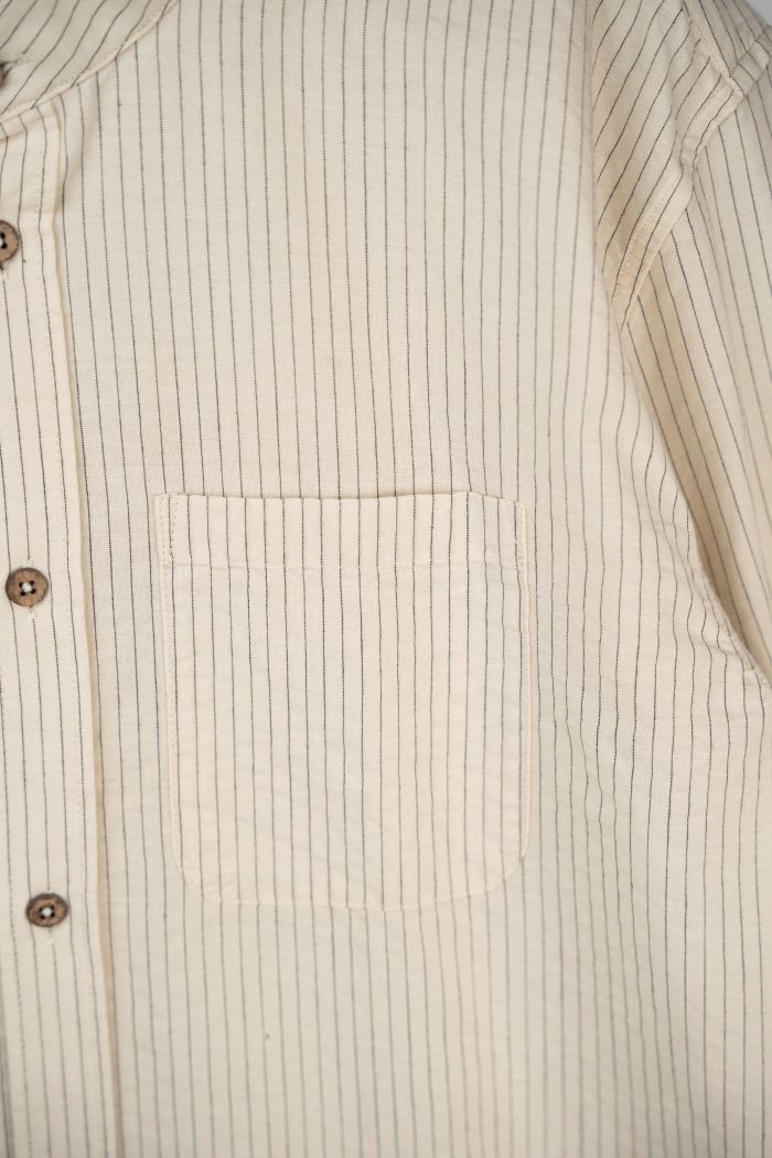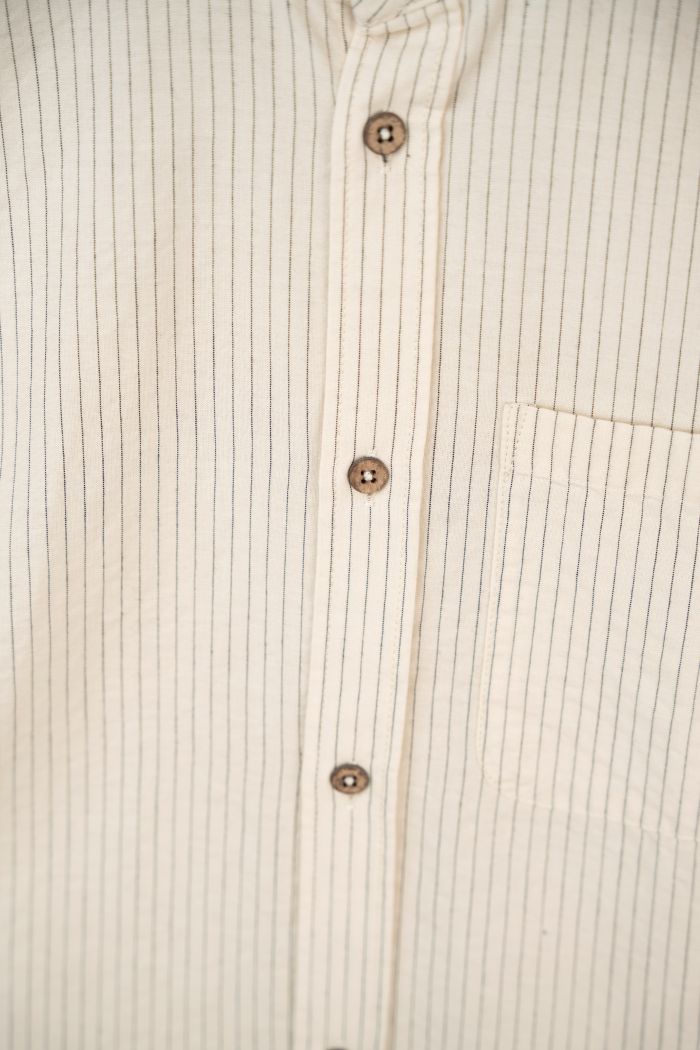 Flot skjorte med rette striber og et nedtonet, tidløst udtryk. Modellen har en klassisk kinakrave, knaplukning hele vejen ned foran og lange ærmer, som afsluttes med en smal manchet og én knap. Skjorten har en let buet kant forneden, der giver et afslappet og klædeligt fald.
