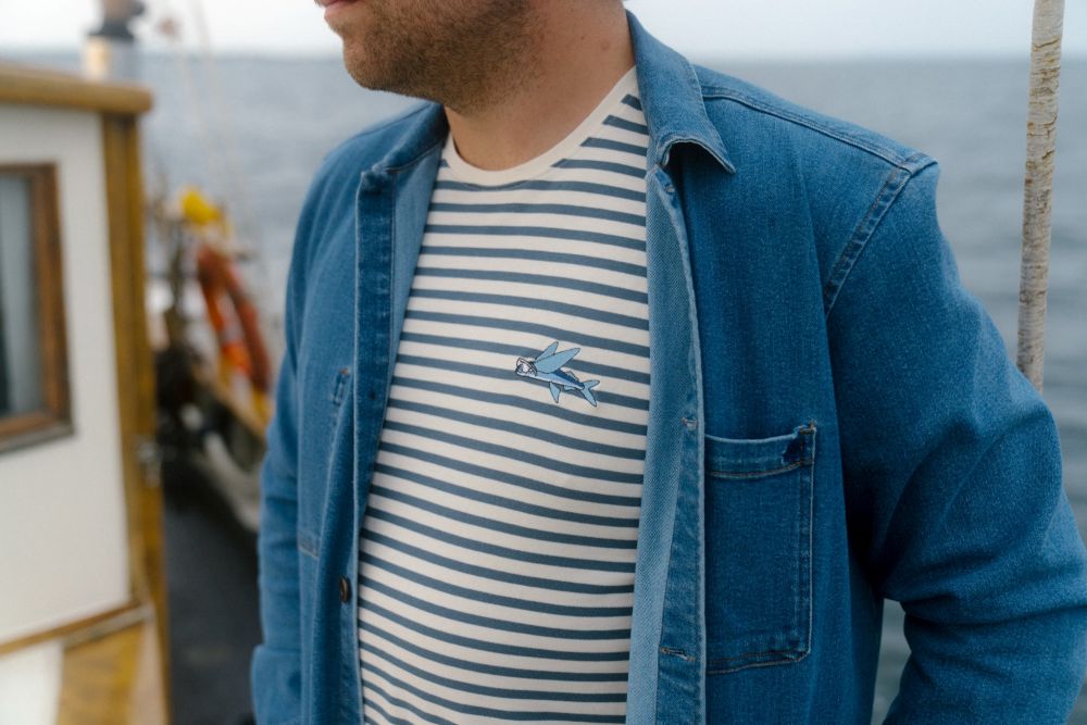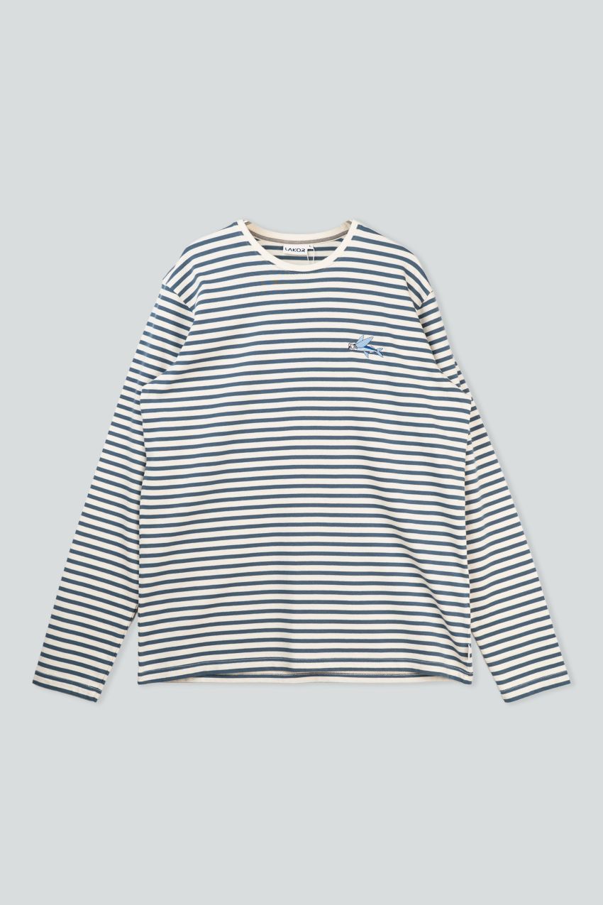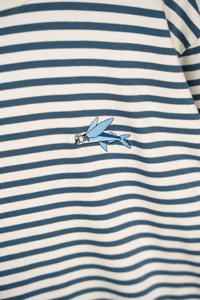 Stribet T‑shirt med lange ærmer – en klassiker fra Lakor i et tidløst og afslappet design. Modellen har rund hals og et fint broderet motiv af en lille blå flyvefisk på brystet, som giver et diskret og charmerende udtryk.