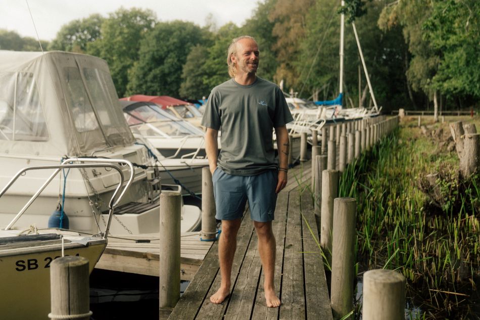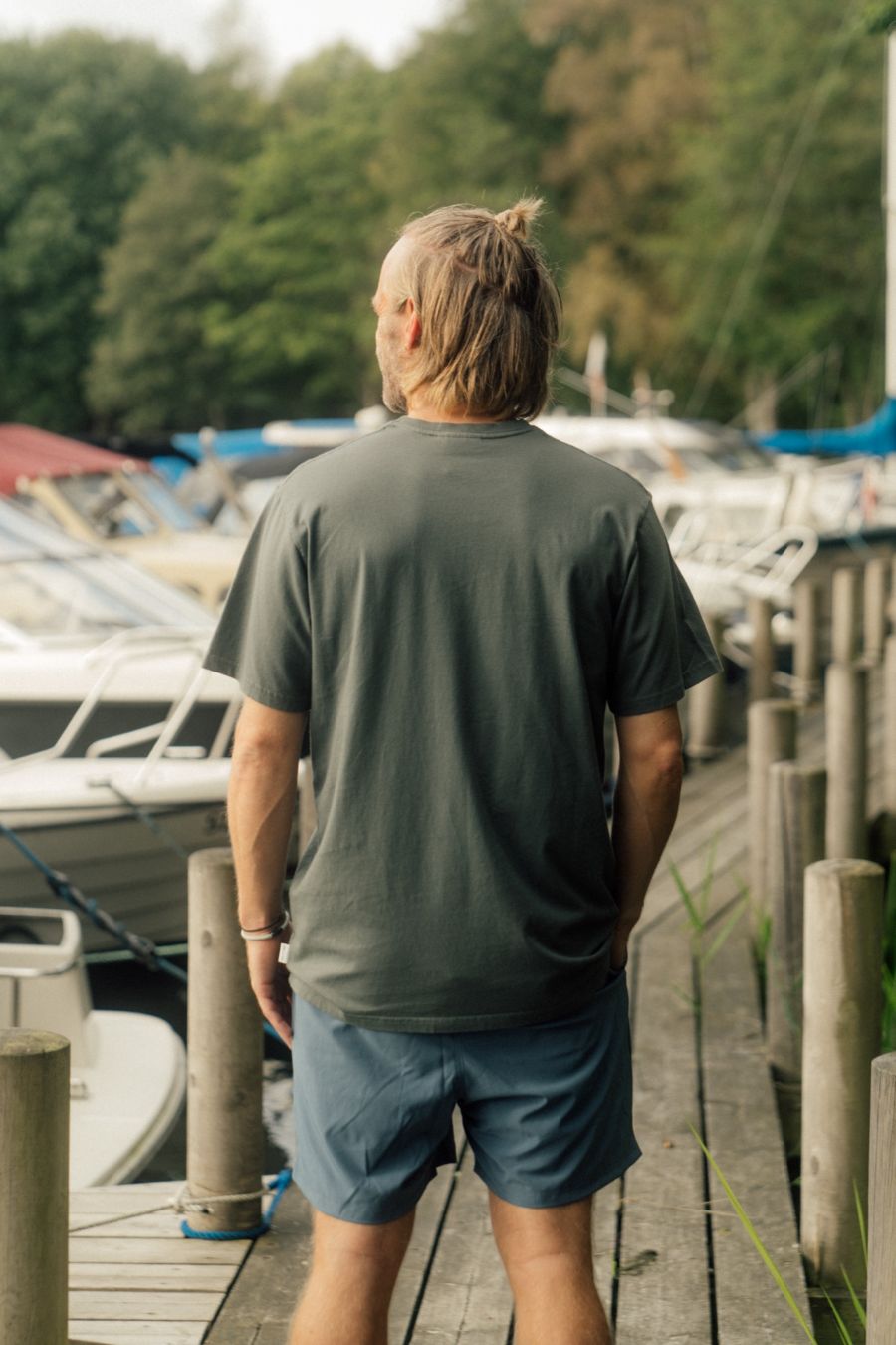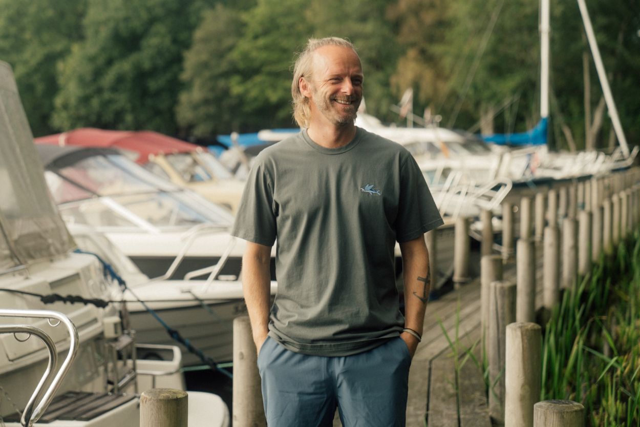 Klassisk T‑shirt med rund hals, korte ærmer og et lille, diskret motiv på brystet. Motivet er en håndtegnet flyvefisk i en flot blå farve, som er broderet på stoffet. Flyvefisken har solbriller på og giver T‑shirten et cool og humoristisk udtryk – helt i Lakors ånd.