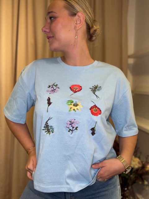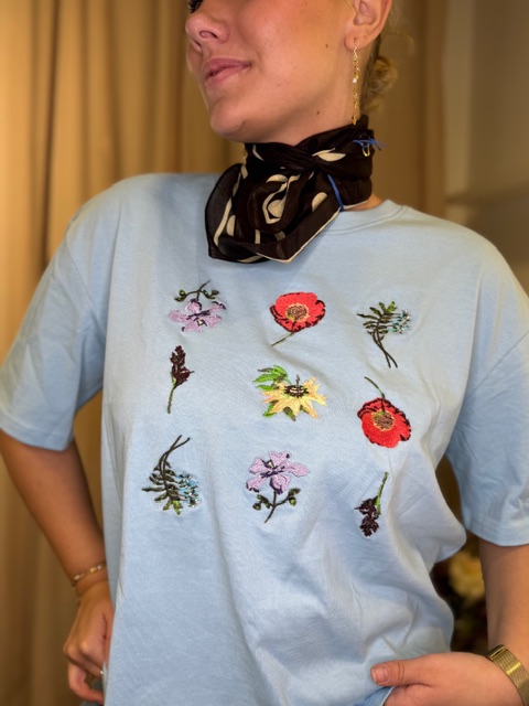 T‑shirt i en moderne boxy facon med smukke blomsterbroderier, der giver et fint strejf af natur og et eksklusivt, feminint udtryk. Modellen har rund hals, korte ærmer med let vidde samt en lidt kort og bred pasform, som skaber et afslappet og tidssvarende look.