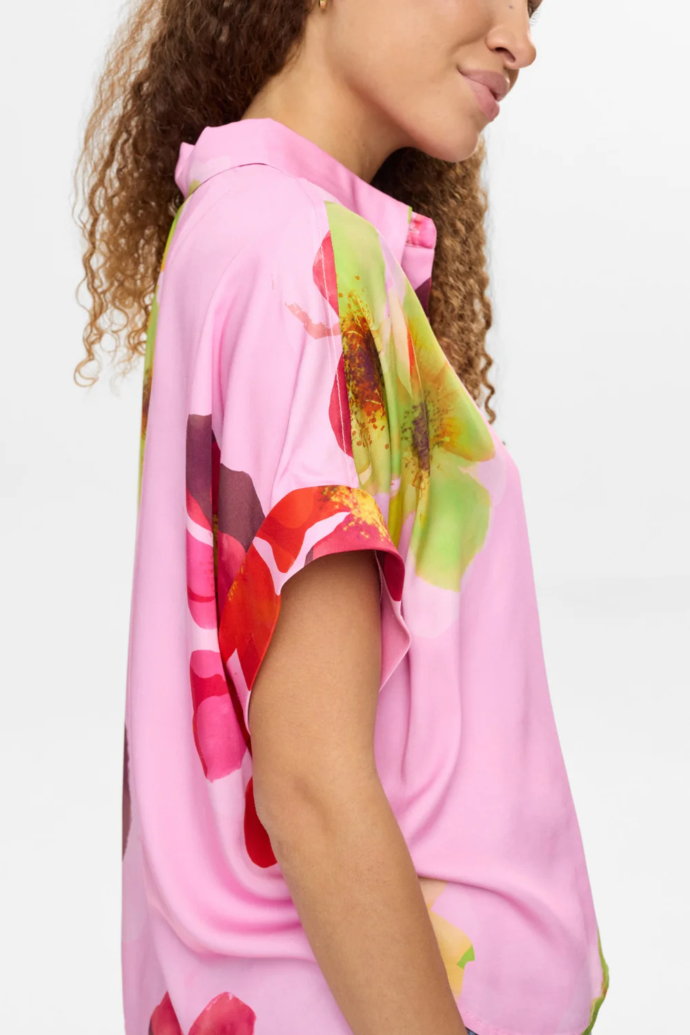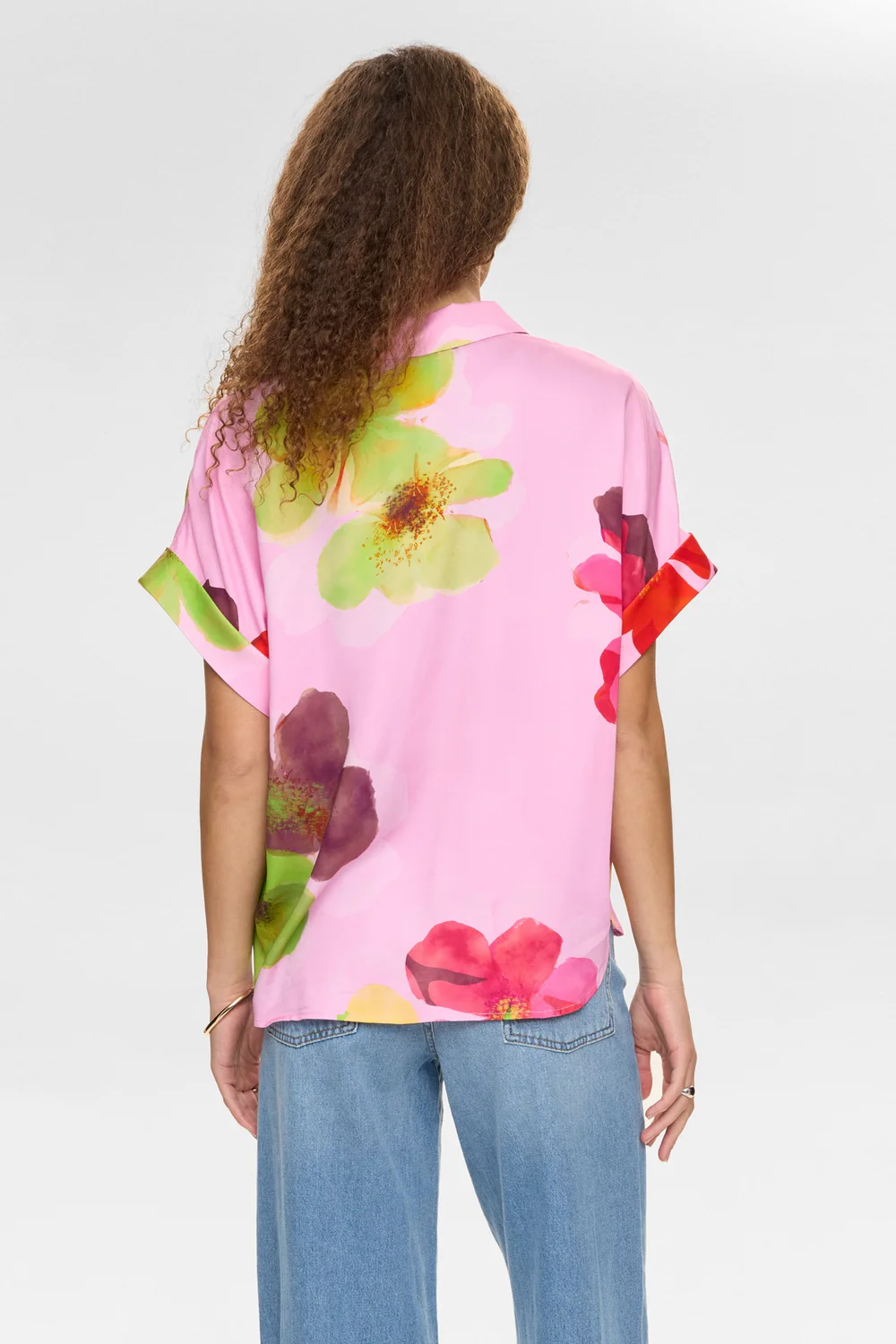 Blomsterprintet består af store, flotte blomster i en harmonisk farvepalette med røde, rosa, lilla, pink, gule og grønne nuancer, som tilsammen skaber et levende og sommerligt look. En bluse, der er nem at style både til hverdag og mere festlige anledninger.