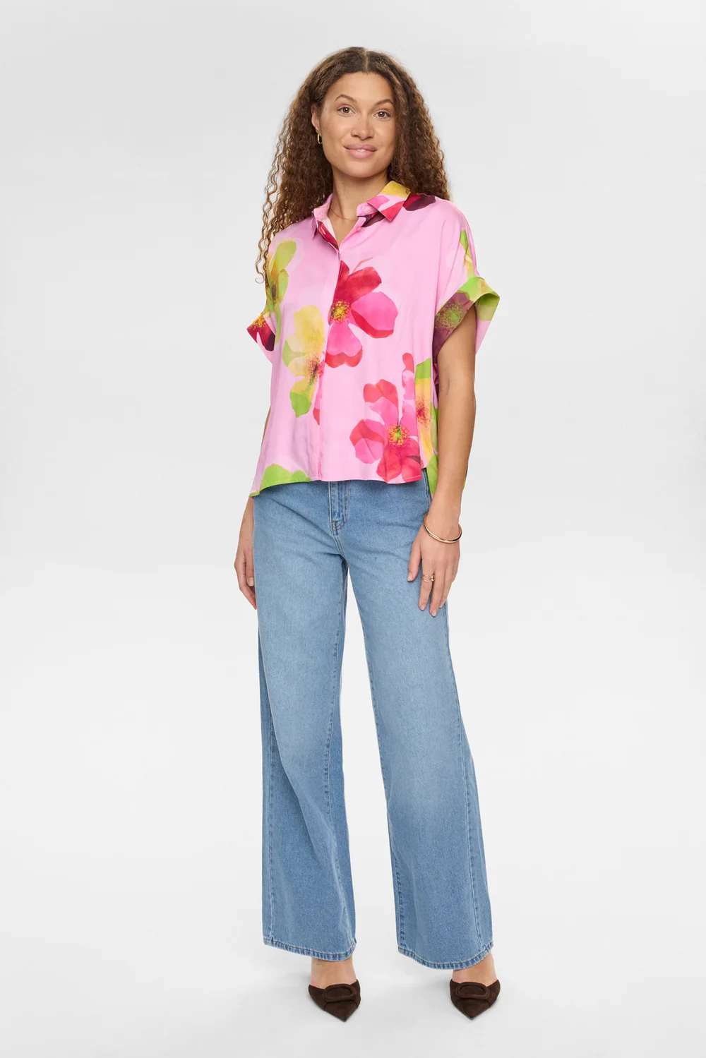 Flot bluse fra NÜMPH med et smukt og iøjnefaldende blomsterprint. Modellen har en løs pasform med drop‑down skuldre, klassisk skjortekrave og er gennemknappet foran. De korte ærmer afsluttes med en bred kant og god vidde, som giver et let og feminint udtryk.