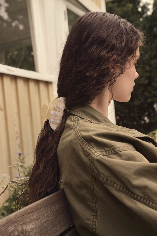 Skøn hårklemme til det store hår i en fin, sart lysegul nuance, dekoreret med små lyseblå hjerter og glimtende rhinsten, som tilfører et legende og eksklusivt touch. En smuk håraccessory, der både holder håret på plads og løfter dit look med et strejf af sommer.