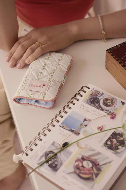 Clutchen lukkes med en klap med trykknap i samme farve. Den er udført i et let og sommerligt print med lyseblåt indvendigt stof og fine små stjernebroderier, som giver et feminint og gennemtænkt udtryk.