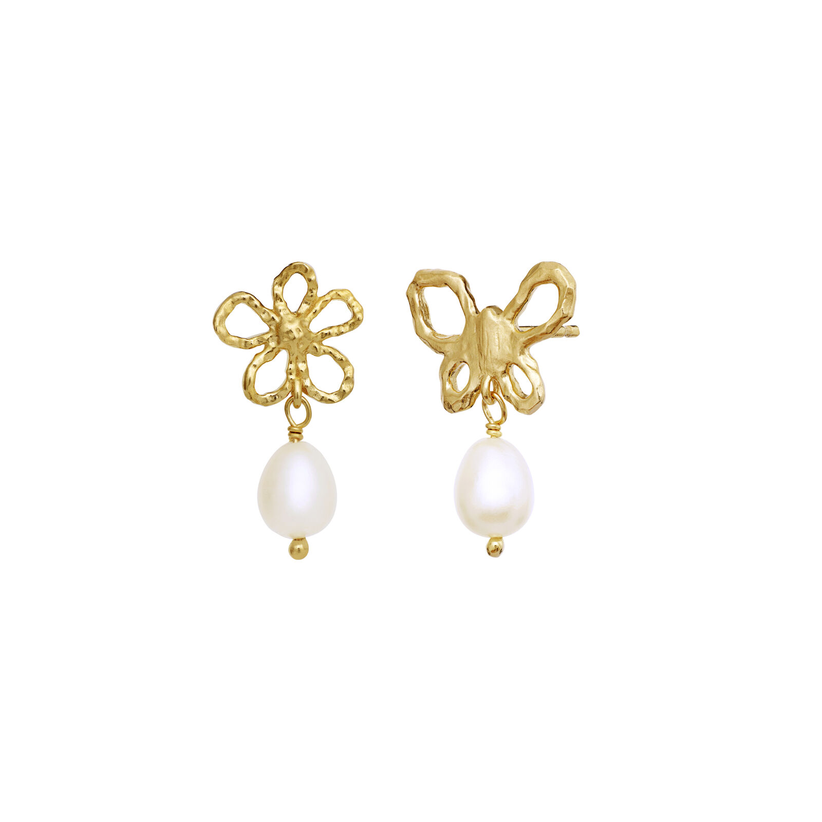 En sommerfugl og en blomst danner tilsammen rammen om dette fine asymmetriske øreringepar. Under hvert motiv hænger en hvid ferskvandsperle, som bevæger sig blidt og tilfører et let og feminint udtryk. To forskellige former mødes smukt i en harmonisk helhed – enkel, poetisk og fuld af symbolik.