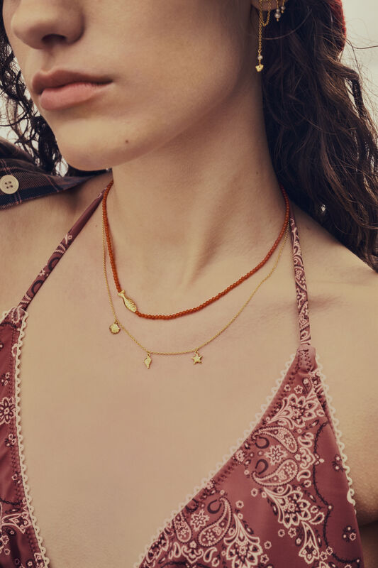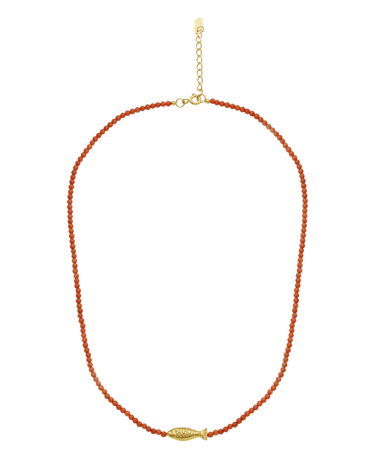Magi fra havet. En smuk kæde prydet med røde koralsten og et fint fiskevedhæng, der hænger i blød harmoni med stenene. Smykket emmer af varme, hav og frihed – som små skatte fundet ved vandkanten på en solrig sommerdag.