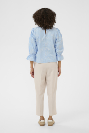 Ærmerne har god vidde med et let puf ved skuldrene samt 3/4‑længde, hvor der nederst er placeret en elastik, som skaber en flot og blød rynkeeffekt. En virkelig sød og let bluse, perfekt til forår og sommer, som nemt kan styles både op og ned – til hverdag såvel som til mere pæne anledninger.