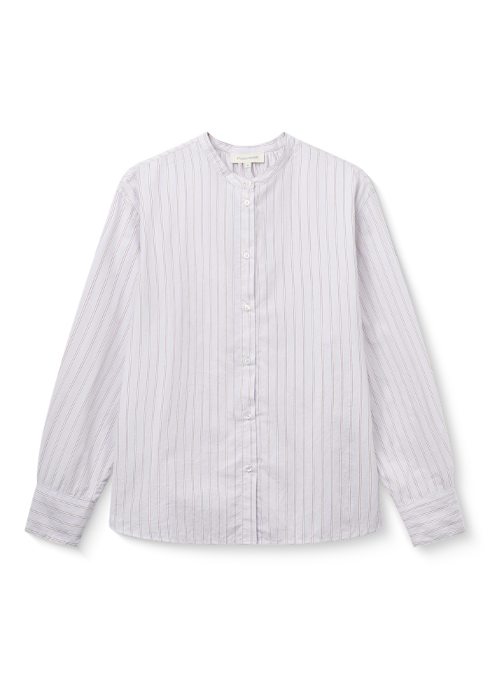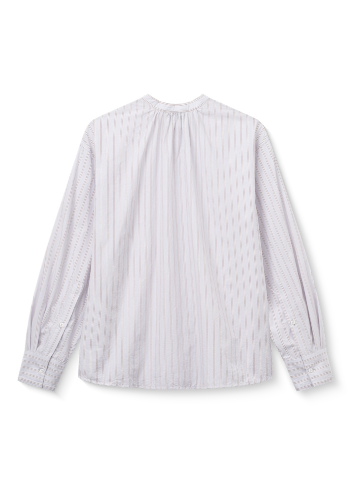 Pasformen er løs og let, hvilket giver et blødt og feminint udtryk. De små rynker øverst ved halsen på ryggen tilfører ekstra lethed og understreger skjortens fine fald. Printet er stribet i lyse og sarte farver, som giver et roligt, nordisk og tidløst look.