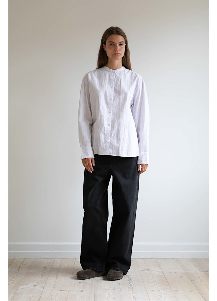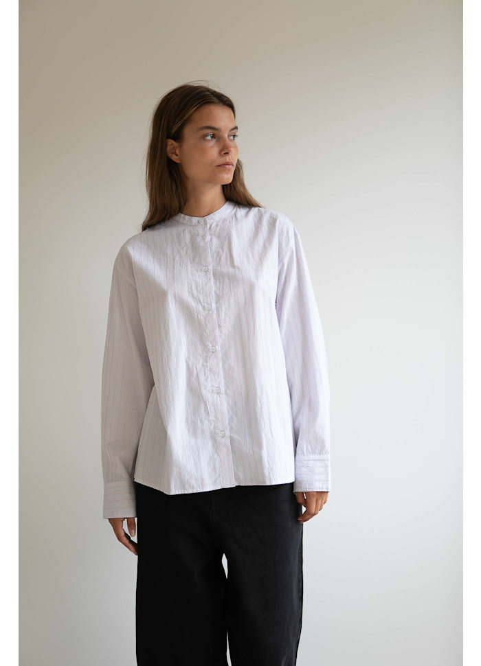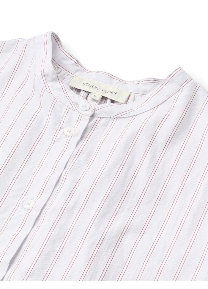Skjorte fra danske Studio Feder, fremstillet i GOTS‑certificeret økologisk bomuld. Skjorten har en klassisk bedstefarskrave og stolpelukning hele vejen ned foran, som lukkes med små hvide knapper, samt lange ærmer med manchetter, der ligeledes lukkes med knapper.