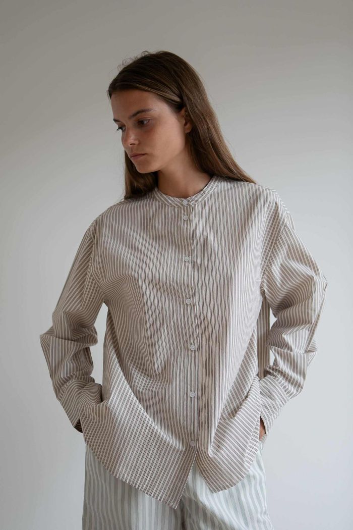 Skjorte fra danske Studio Feder, fremstillet i GOTS‑certificeret økologisk bomuld. Skjorten har en klassisk bedstefarskrave og stolpelukning hele vejen ned foran, som lukkes med små hvide knapper, samt lange ærmer med manchetter, der ligeledes lukkes med knapper.