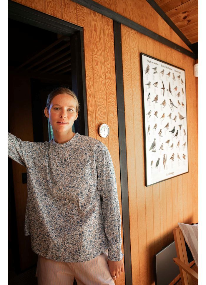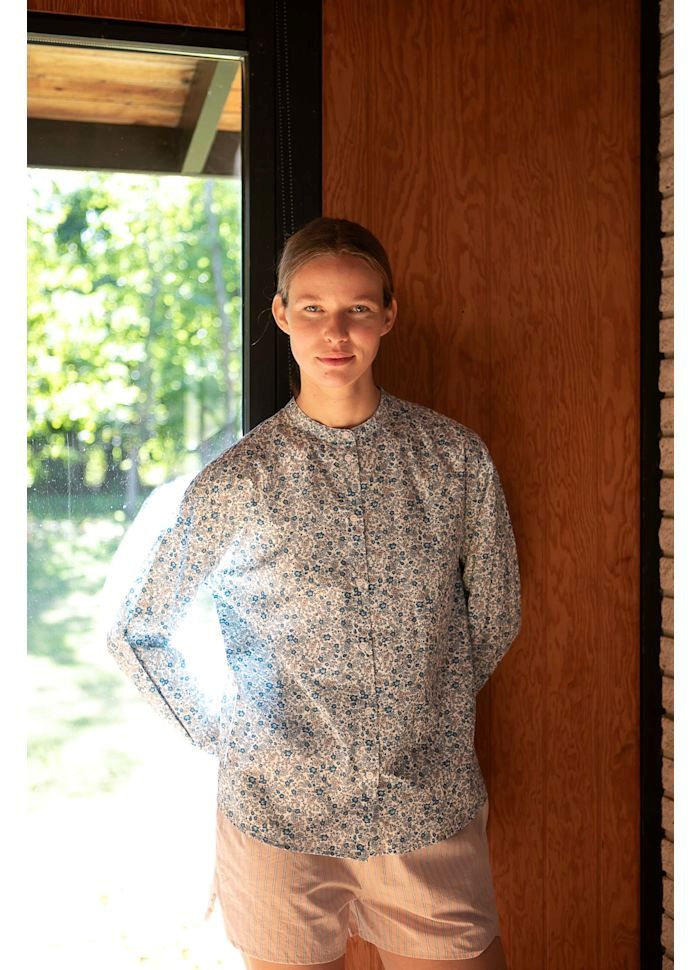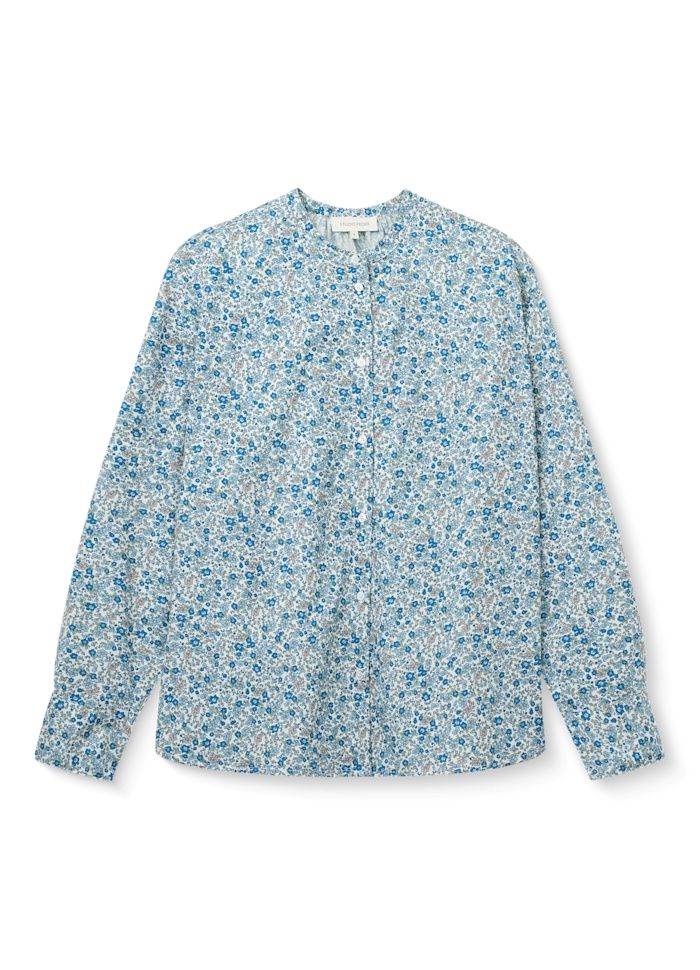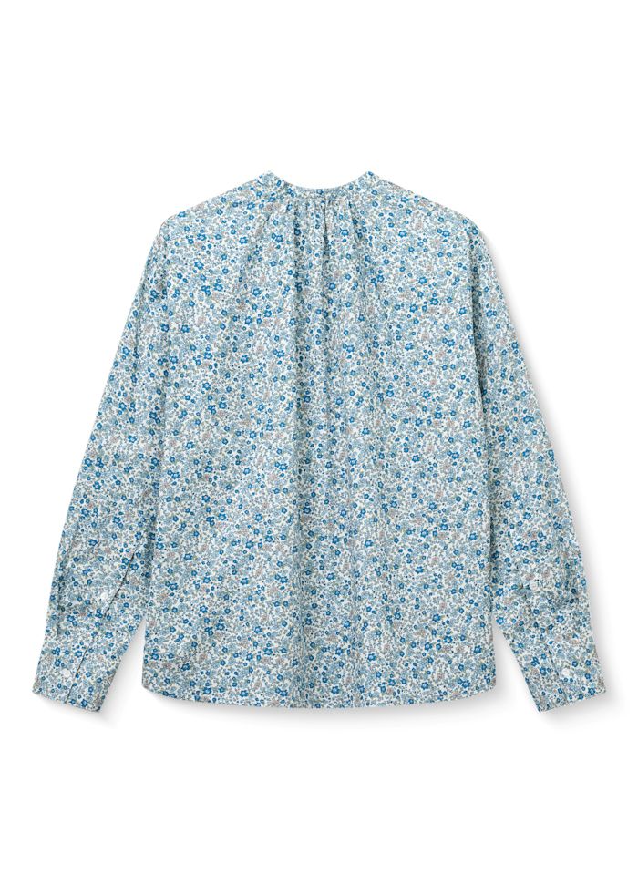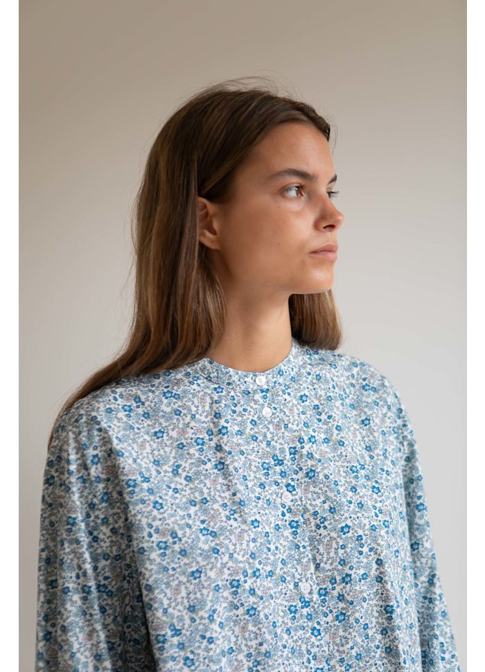Pasformen er løs og let, hvilket giver et blødt og feminint udtryk. De små rynker øverst ved halsen på ryggen tilfører ekstra lethed og understreger skjortens fine fald. Printet består af de yndigste små blomster i blå nuancer, som giver skjorten et roligt, romantisk og tidløst udtryk.