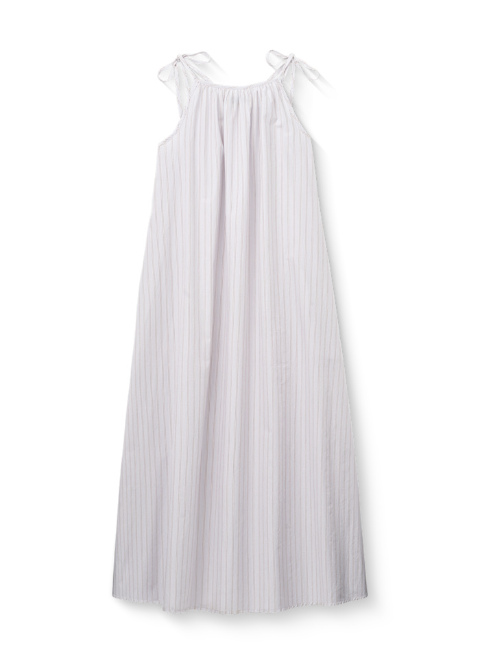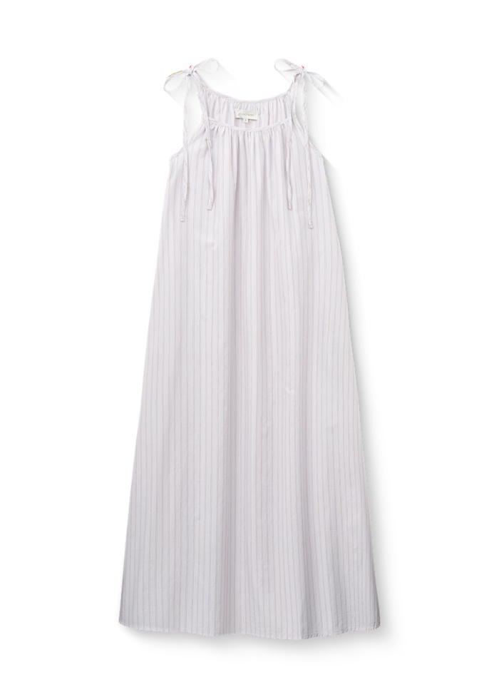 Kjolen er ideel til varme sommerdage og ferier i solrige egne. Printet er stribet i lyse og sarte farver, som skaber et roligt, nordisk og tidløst udtryk. En let og anvendelig kjole, der nemt kan styles både casual og mere feminint.