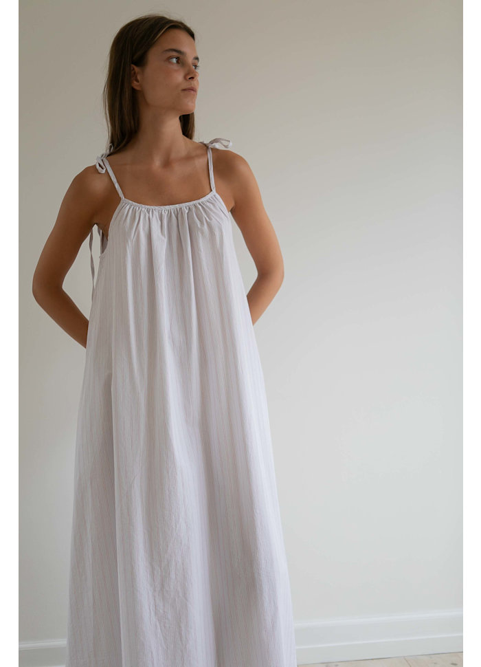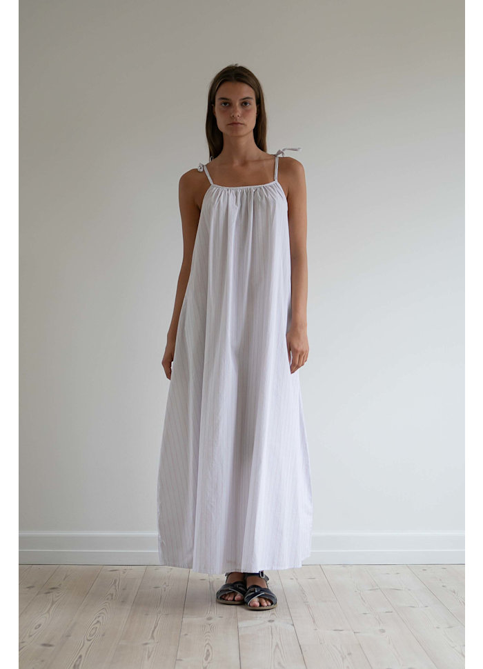 Stropperne er justerbare og bindes i fine sløjfer, så du nemt kan tilpasse pasformen efter behov. Alle indvendige sømme er udført som franske sømme, hvilket giver et ekstra gennemarbejdet og smukt finish. Kjolen har desuden skjulte sidelommer, som gør den både praktisk og afslappet.