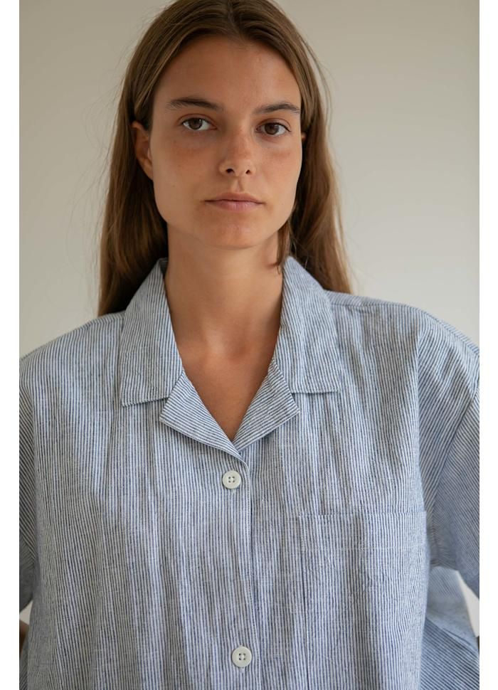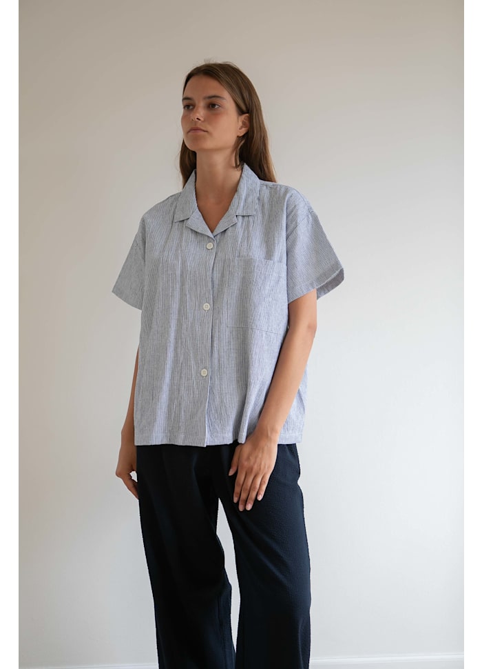 Skjorten har klassisk skjortekrave og tre hvide knapper ned foran. Pasformen er loose, og modellen er lidt kortere i længden, hvilket giver et let og moderne fald. Derudover har skjorten en enkel brystlomme, som understreger det enkle og funktionelle design.