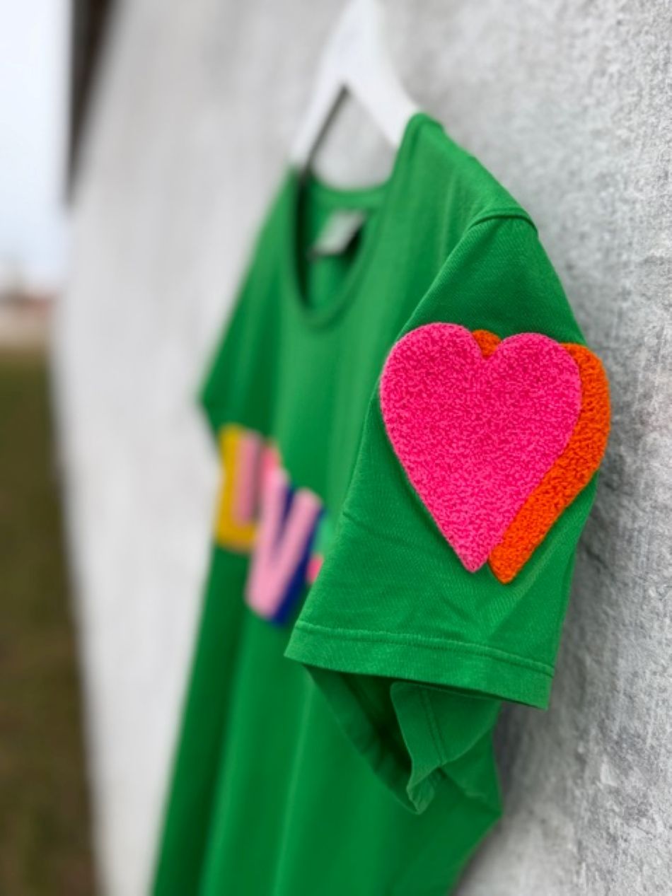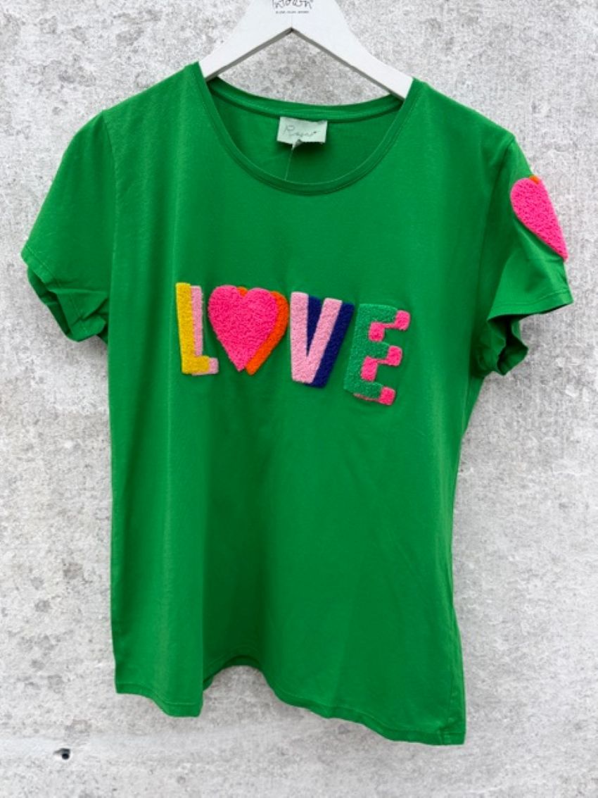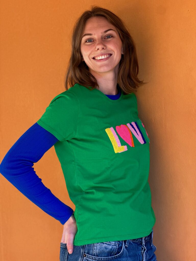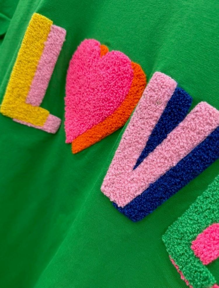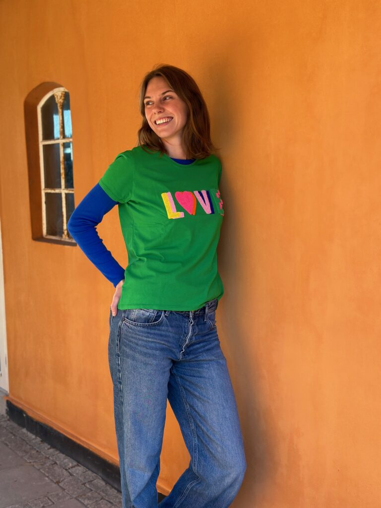 Denne grønne T‑shirt har et dobbelt og tæt broderet LOVE‑statement i klare farver, der komplementerer hinanden og skaber et positivt og iøjnefaldende udtryk