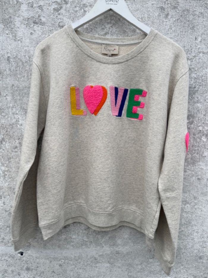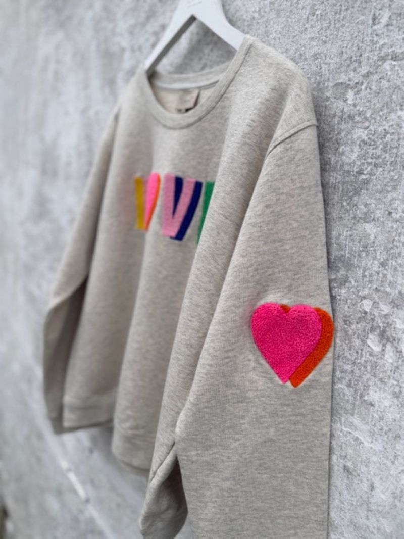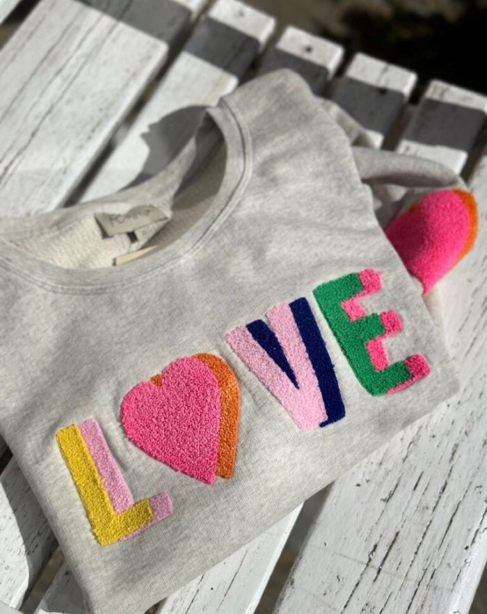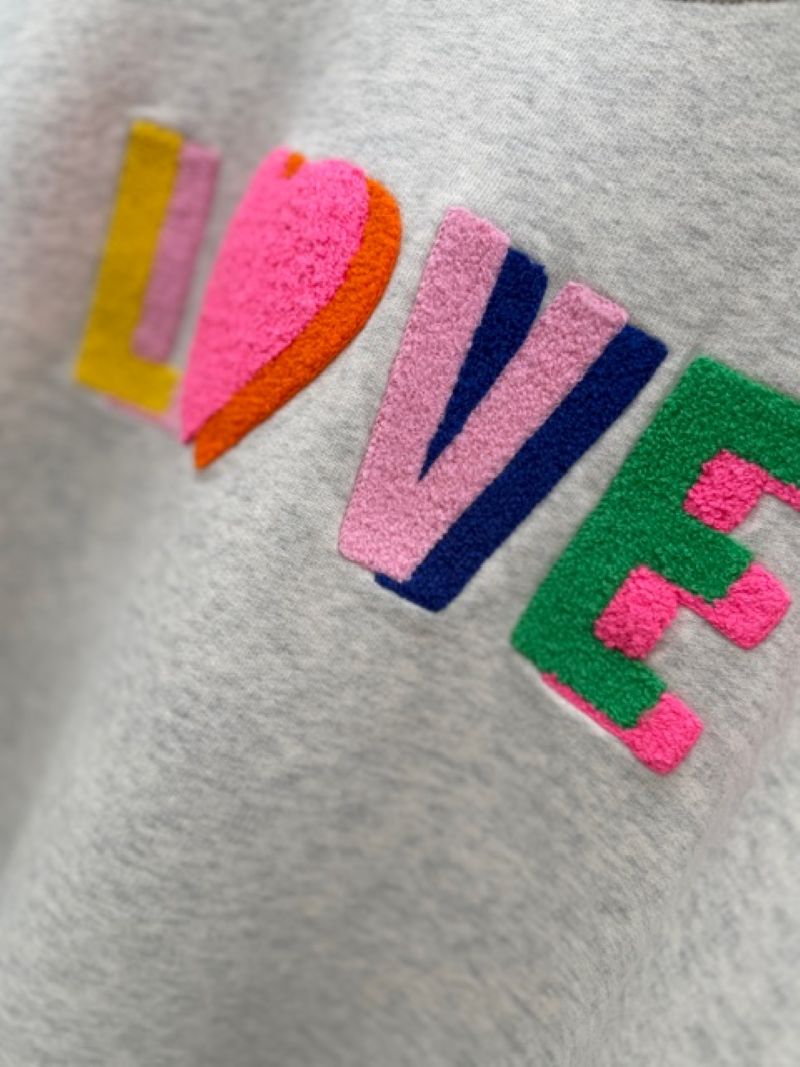 En blød og stilfuld sweatshirt med LOVE‑broderi fra det danske brand LULU’S LOVE. Sweatshirten har et dobbelt, tæt broderet LOVE‑statement i klare farver, der smukt komplementerer hinanden og giver et positivt og iøjnefaldende udtryk. Som ekstra detalje finder du et dobbelt hjerte broderet på venstre ærme.
