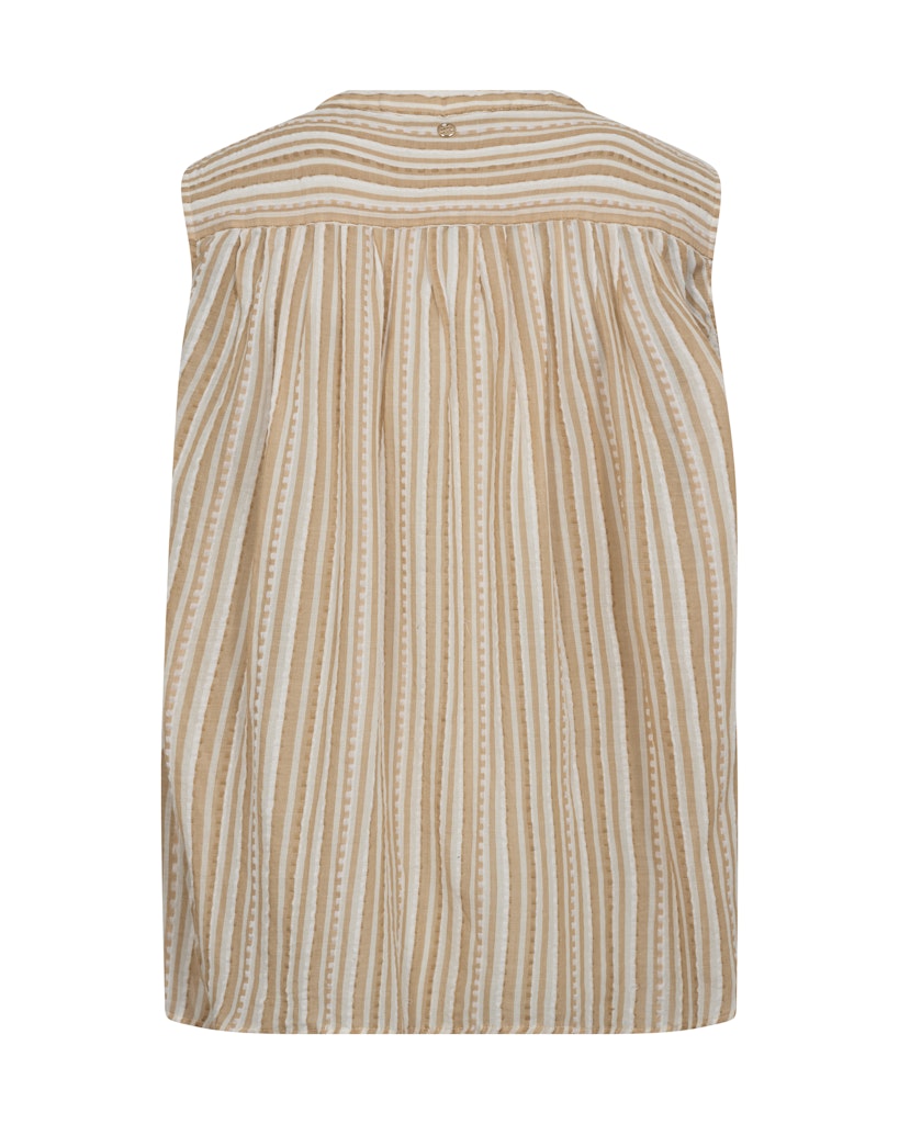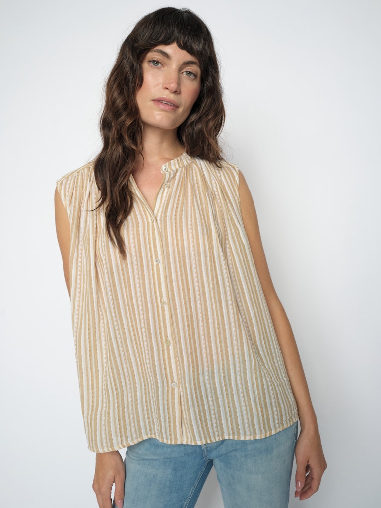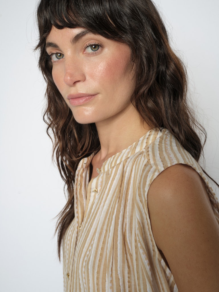Ved overskæringen både foran og bagpå er der små rynker, som giver et blødt fald og ekstra lethed. Blusen er ærmeløs med god vidde, hvilket gør den behagelig på varme dage. Modellen er en smule længere bagpå end foran, hvilket giver et flot og afslappet look.