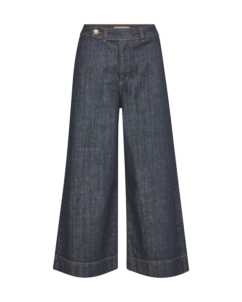 Flotte jeans fra MOS MOSH i en nuanceret mørkeblå farve. Modellen har lige ben med god vidde og en cropped længde, som giver et moderne og cool udtryk. Jeansene har bæltestropper og en asymmetrisk lukning i taljen, der lukkes med skjult lynlås og en dekorativ guldfarvet knap.