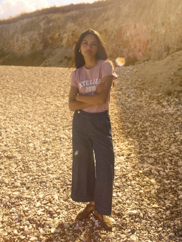 Foran er der skrå sidelommer, og bagpå to lommer med flap – over den ene baglomme ses et fint, diskret logo. En stilren og gennemført buks med enkle detaljer, der gør den nem at style både casual og mere elegant.